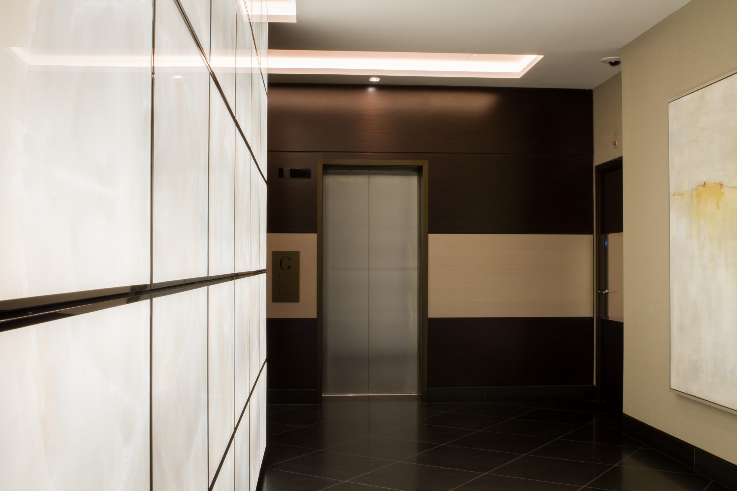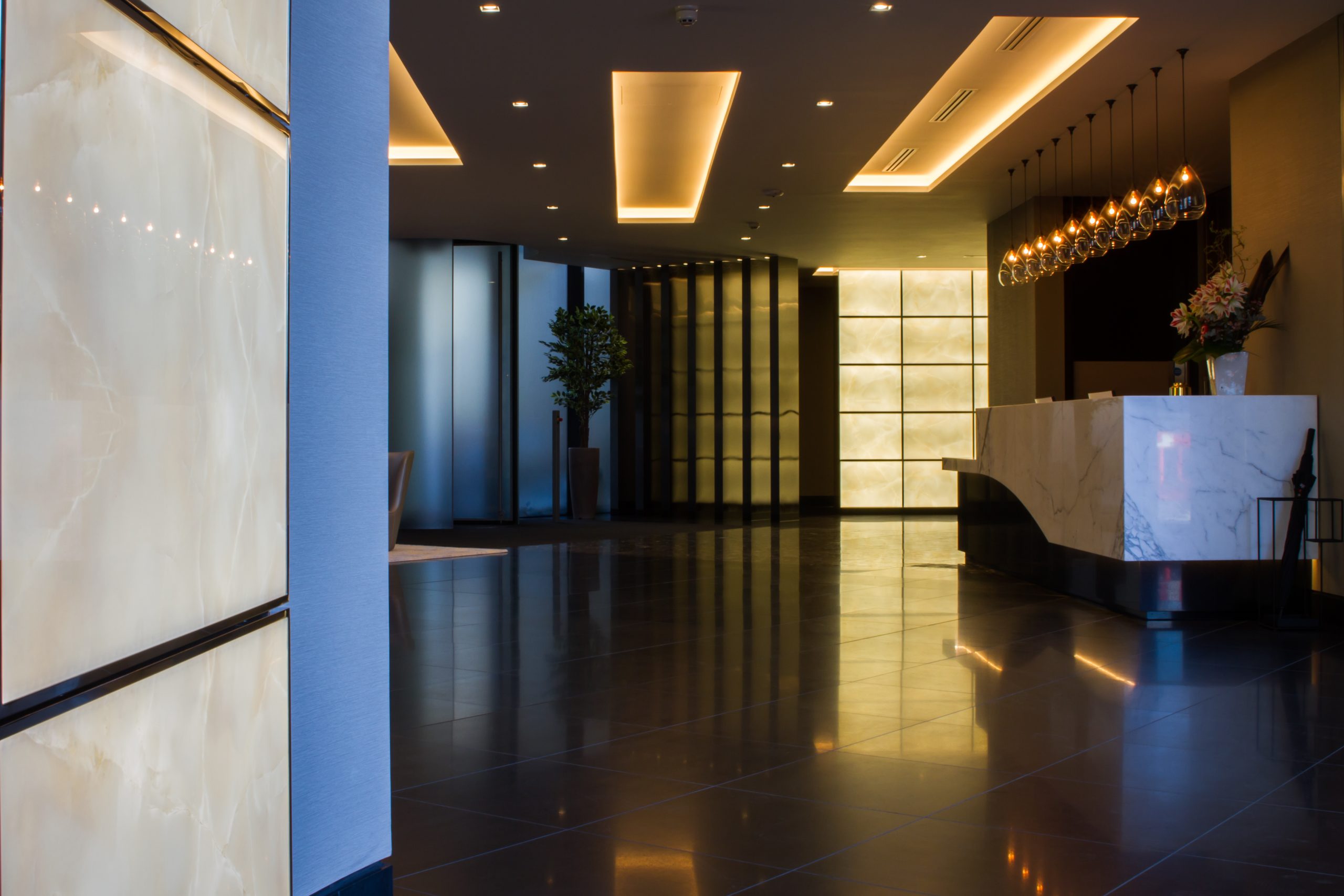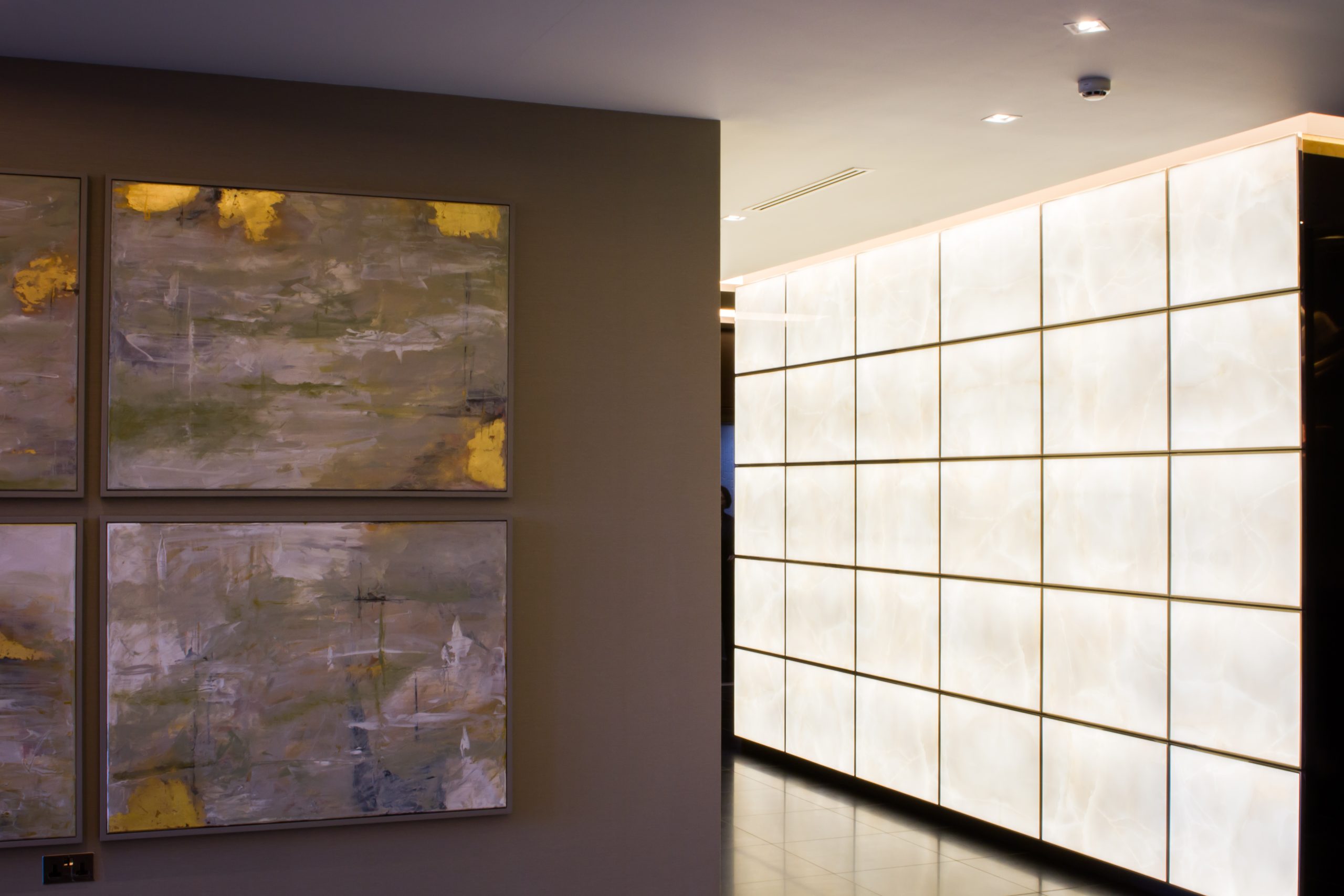 three illuminated onyx feature walls to The Corniche main reception. Evans Turner were involved early within the design stage to work with St James and John Roberts Architects to amalgamate and incorporate each party’s requirements. The Evans Turner site team worked meticulously and with great accuracy to create a unique and stunning feature piece for The Corniche reception.”