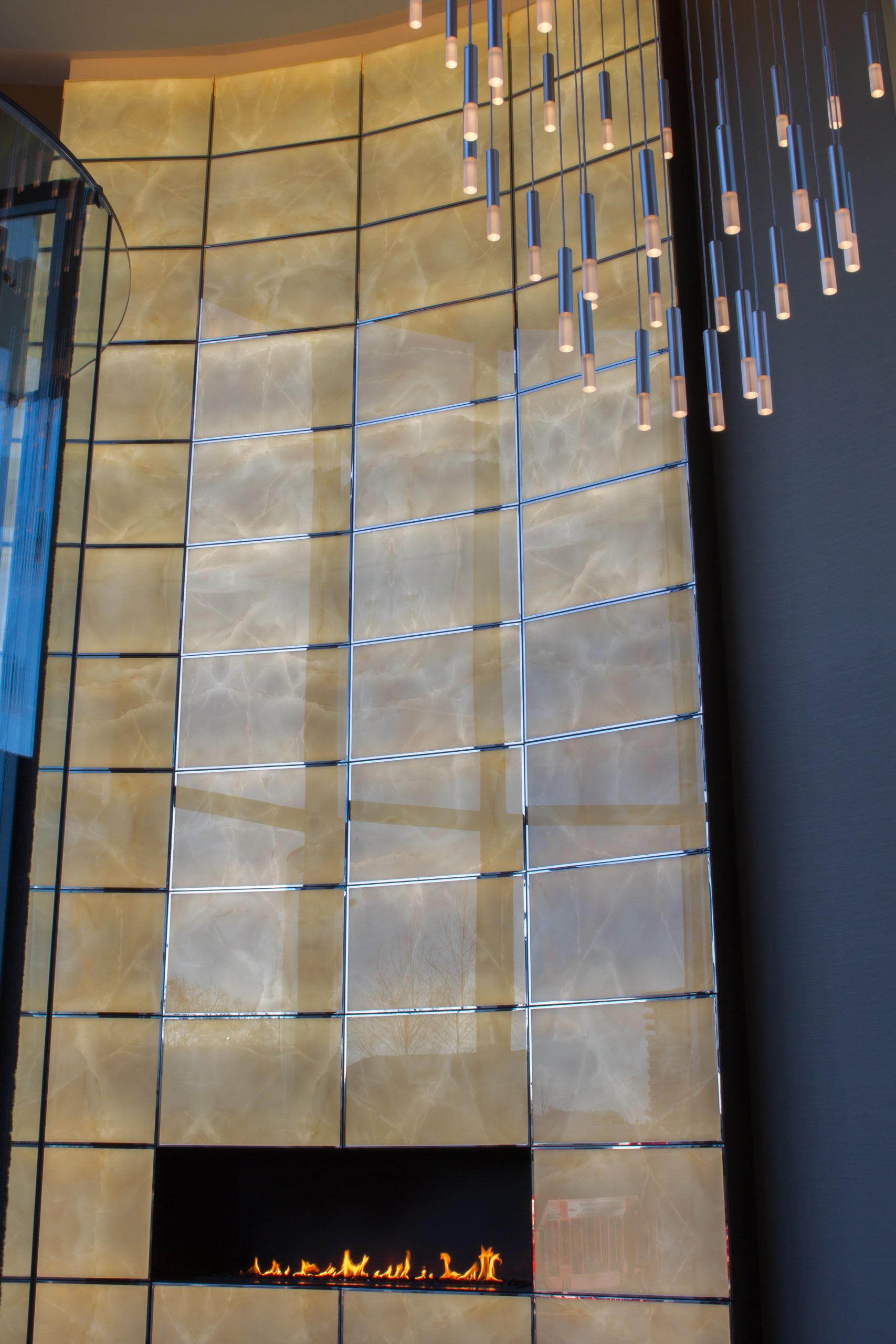 framed with mirror polished stainless steel Vee-Fold® trims. The panels are installed on the main curved lobby wall, providing a faceted light wall around the feature fireplace as well as internal mailbox walls.